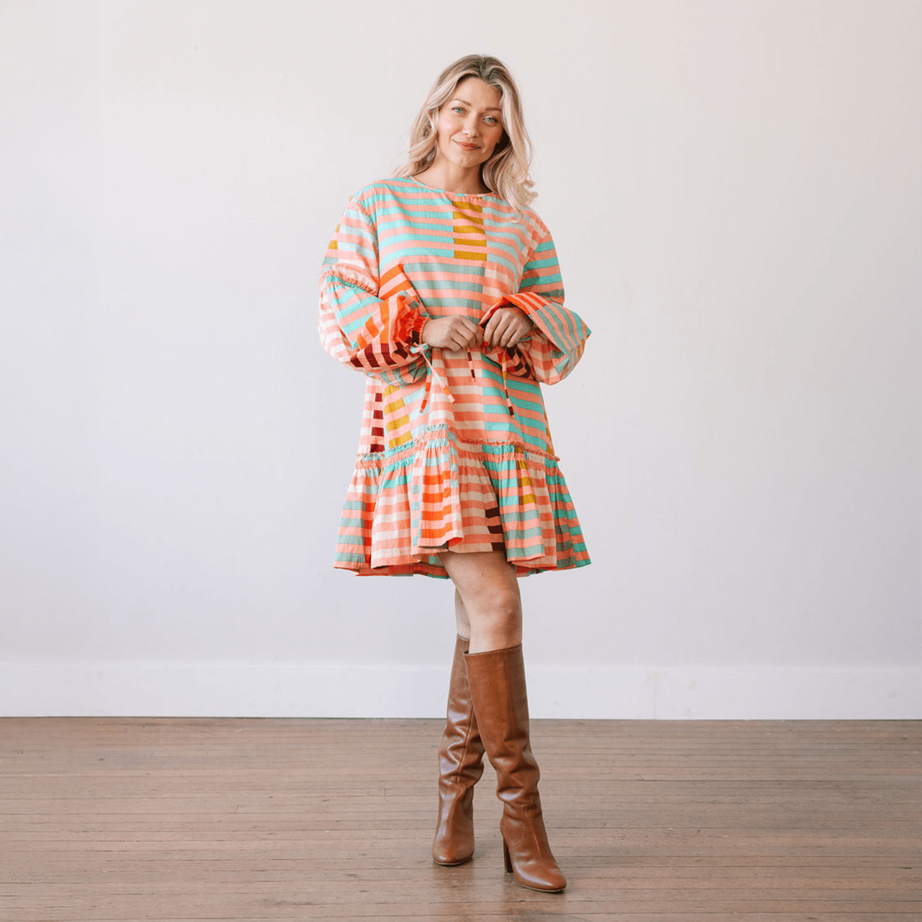 The Apricot Colorful Stripe Khai Mini Dress is a playful statement piece with a vibrant mix of apricot, teal, and orange stripes. Its voluminous puff sleeves and tiered hem add a whimsical flair, perfect for brightening any day. Pair with sandals on warmer days and when the days cool, throw on your favorite boots and sweater vest for an effortless layered look.